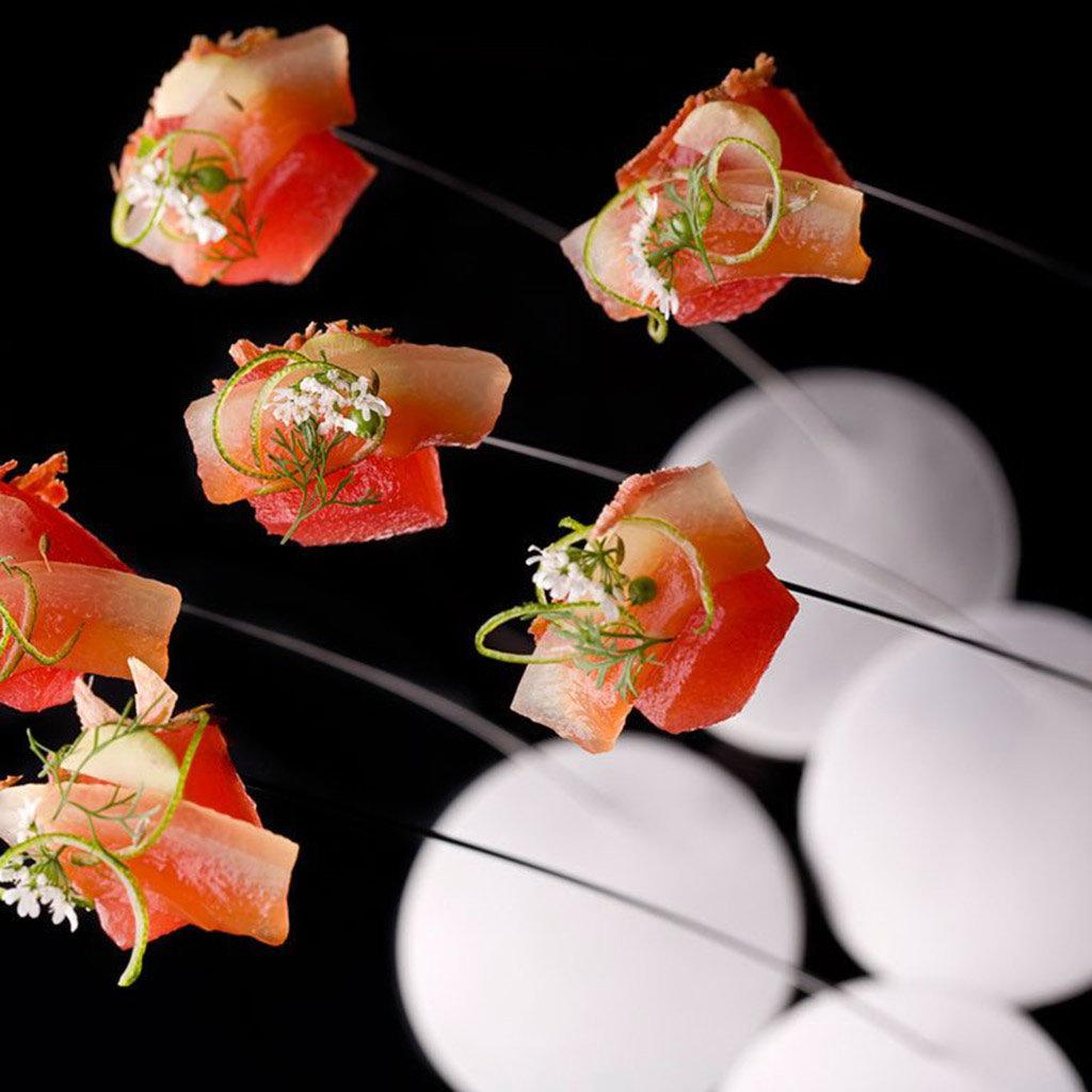 A self-supporting skewer which subtly sways, giving life and movement to food.